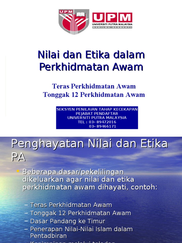 Nilai dan etika dalam perkhidmatan awam. Etika perkhidmatan awam terkandung dalam tonggak dua belas iaitu, menghargai masa, ketekunan membawa kejayaan, keseronokan. (b) perkhidmatan kehakiman dan perundangan; View more presentations from aimm reka. Etika seharusnya dipelajari dan diamalkan dalam kehidupan seharian kita.