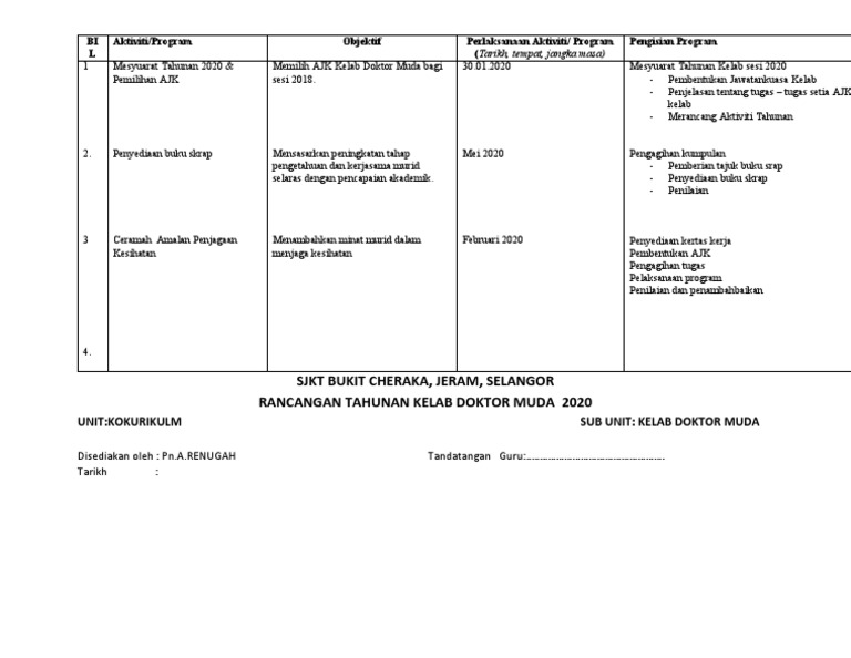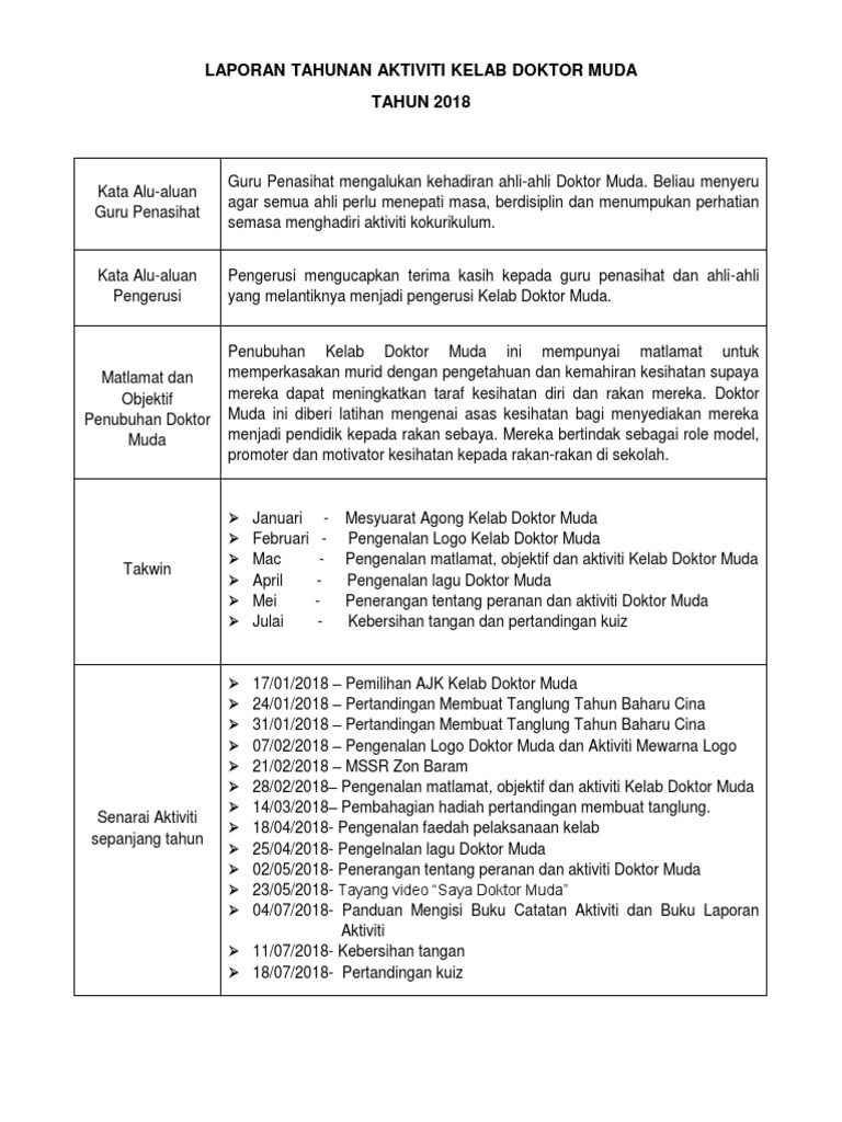 Rancangan Tahunan Kelab Doktor Muda - Aktiviti Asas Kelab Doktor Muda 2017 : Alhamdulillah.dengan berkat kesungguhan guru penyelaras kelab doktor muda yang sentiasa berganding bahu dalam melatih dr muda.. Alhamdulillah.dengan berkat kesungguhan guru penyelaras kelab doktor muda yang sentiasa berganding bahu dalam melatih dr muda. Perancangan aktiviti tahunan doktor muda sjk(t) west country (timur) tarikh tempat aktiviti catatan 7/2/2018 bilik wawasan sjk(t)td mesyuarat perancangan aktiviti tahunan 21/2/2018 pusat sumber perjumpaan ahli unit beruniform dan pendaftaran ahli baru sesi. Sekolah menegah kebangsaan usj 8 kelab kebudayaan (sesi petang) rancangan aktiviti tahunan 2011 bi l 1 2 3 4 5 6 7 8 10.30 rancangan aktiviti mesyuarat agong kelab kebudayaan pertandingan ujibakat latihan dikir barat pertandingan. Where everyone can share their health education information here. Konvensyen doktor muda peringkat kebangsaan kali kedua telah diadakan pada 6 hingga 9 ogos 2006 di rancangan masa depan mom adalah seperti berikut: